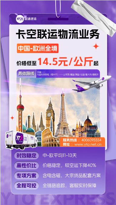 通过持续优化路由及增加合作航线,当前圆通卡空联运至欧洲全境的平均时效已提升至11-13天,与空运慢线时效相当。同时通过陆空联运模式,可有效规避国内主要航空枢纽旺季运力瓶颈及排舱问题,即便业务高峰也能保障稳定发运频次,确保供应链畅通无阻。