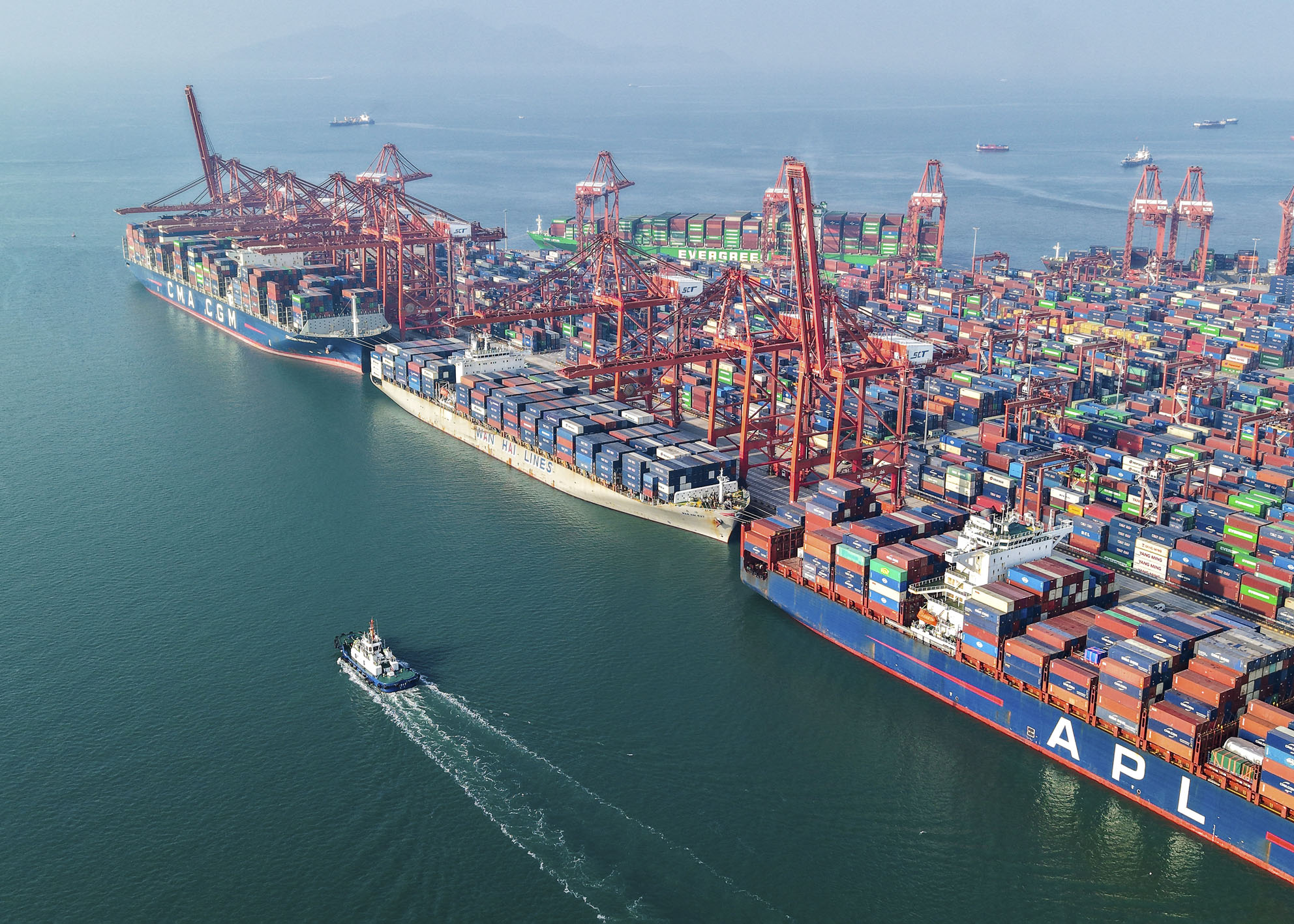 临近年底,在神州大地的海岸、河岸,一座座港口繁忙运转、昼夜不息。在无人机的镜头下,处处是装卸货物、物流运输的繁忙图景,折射出中国经济顶压前行、向新向优发展的活力与韧性。图为深圳西部港区蛇口集装箱码头(无人机照片)。