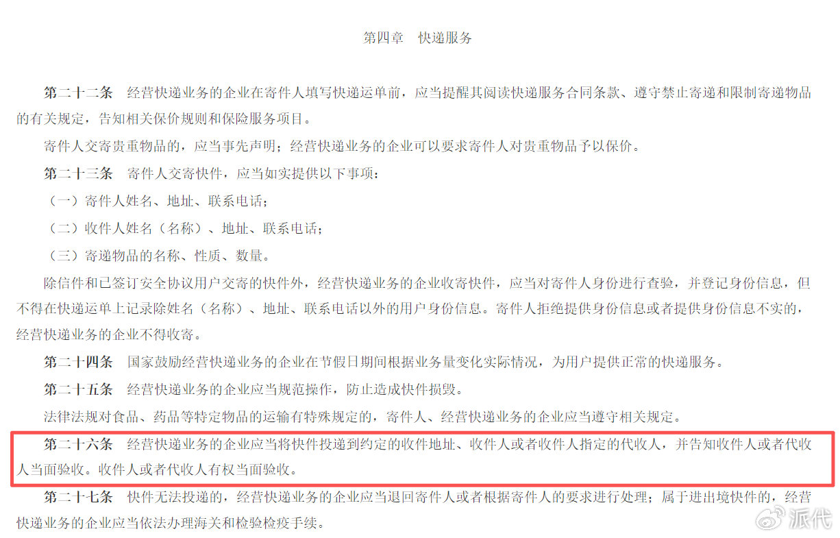 其中最受关注的是第五十二条规定:未经用户同意擅自将快件投放至智能快件箱、代收点,或造成快件损毁的,快递企业将面临2000元至1万元罚款,情节严重者可处以1万元至3万元罚金。