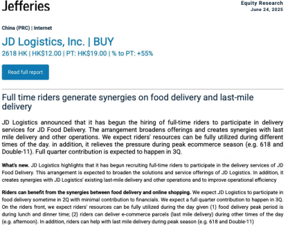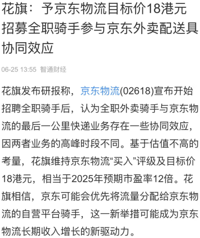 多机构看好京东物流 招全职骑手参与外卖配送具协同效应