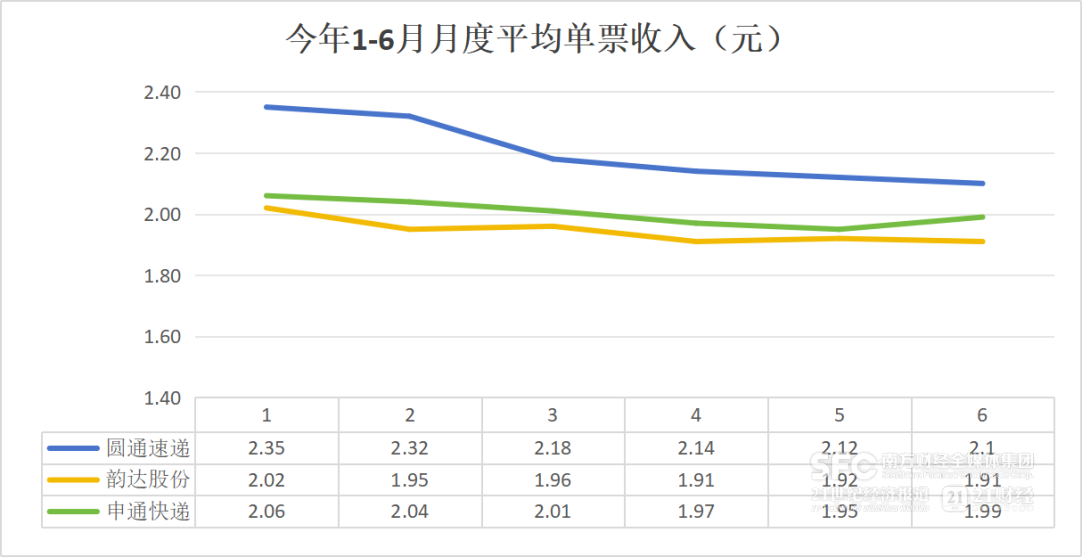 多家A股上市快递公司的数据显示,今年上半年,快递单票月度平均价格持续下滑。韵达股份(002120.SZ)、申通快递(002468.SZ)等加盟制快递企业的票均价格已跌破2元大关。