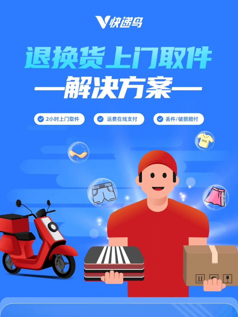 快递鸟电商退换货上门取件方案,为退换货用户提供2小时上门取件的服务,用户只需在电商平台一键退货呼叫快递员上门取件即可,解决平台的逆向物流管理问题,比如退货后的退货退款监控等。