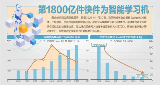 12月1日,国家邮政局监测数据显示,截至2025年11月30日,我国快递年业务量首次突破1800亿件。这件快递是深圳市一位市民网购的智能学习机,从京东智狼仓发出,经无人快递车运输,由快递员送货上门。