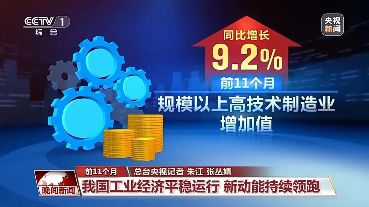 此外,新动能成长势头强劲,成为增长核心引擎。前11个月,规模以上高技术制造业增加值同比增长9.2%,11月当月增速达8.4%。分产品看,3D打印设备产量同比增长100.5%,工业机器人增长20.6%,新能源汽车产量达184.1万辆、同比增长17.0%。