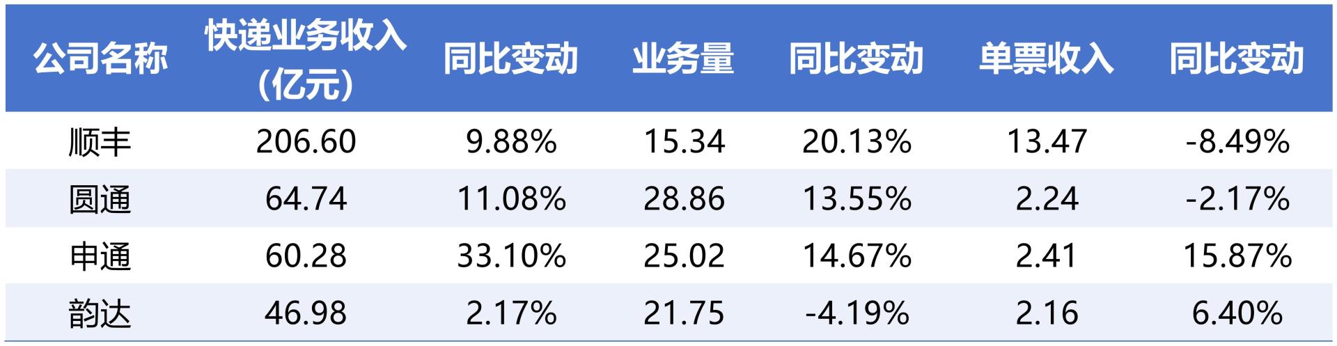 自2025年8月开始,全行业有过一轮涨价潮,华创证券研报分析,11月份的单票收入较涨价前的7月份提升幅度分别为:圆通提升0.16元,韵达提升0.25元,申通提升0.44元(受并表丹鸟影响)。8月至11月的数据从单票收入角度验证了行业提价逻辑。这意味着,虽然同比数据因去年同期基数不同而有涨有跌,但若将时间线拉近观察,在今年8月行业呼吁快递头部企业集体涨价之后,主要快递企业的单票收入均已实现企稳回升。