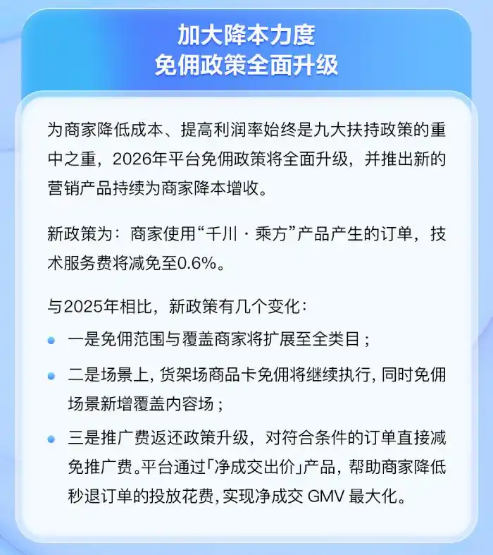 扶持方案聚焦于降低商家经营成本,2026年平台对免佣政策进行升级。商家使用“千川·乘方”产品产生的订单,技术服务费将减免至0.6%。免佣范围在原有基础上扩展至全类目,适用场景由货架场商品卡进一步覆盖至内容场。同时,平台对推广费返还政策进行优化,对符合条件的订单直接减免推广费,并通过“净成交出价”等产品,降低秒退订单等无效投放带来的成本损耗,以提升投入产出效率。