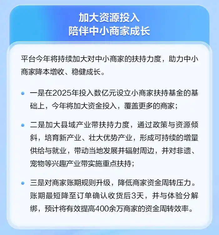 针对不同发展阶段的商家,平台提出差异化扶持安排,包括通过专项计划支持品质商家稳步发展,降低新商家入驻和起步成本,并为中小商家提供资金、流量和服务支持。同时,平台加大对县域产业带和特色产业的扶持力度;优化账期规则,账期最短可降至订单确认收货后3天,以缓解商家资金周转压力。