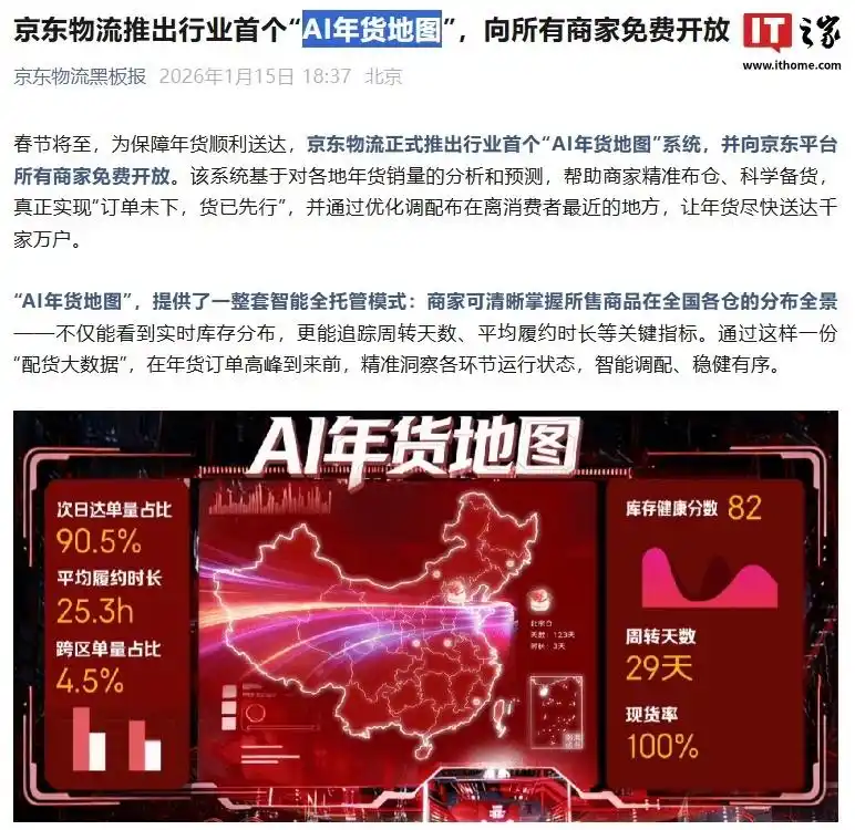 IT之家消息,据京东物流黑板报公众号消息,为保障年货顺利送达,京东物流正式推出行业首个“AI 年货地图”系统,并向京东平台所有商家免费开放。