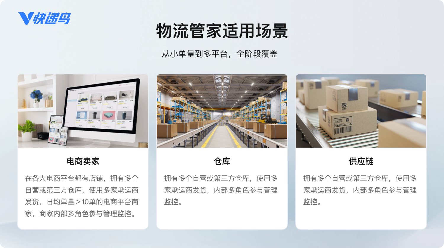 对中小商家、个体工商户、无专业技术团队的用户而言,无需复杂对接,快递鸟物流管家这类SaaS工具就能快速实现批量查件,核心优势是零开发、易操作、功能全面,兼顾查询与基础物流管理需求。