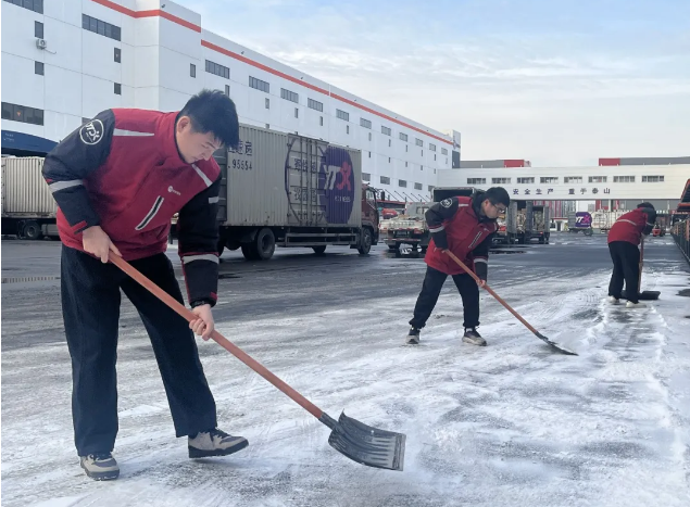 各省区第一时间清理加固集运中心屋顶及棚架,撒布融雪剂,车辆安装防滑链,严格检查车况。