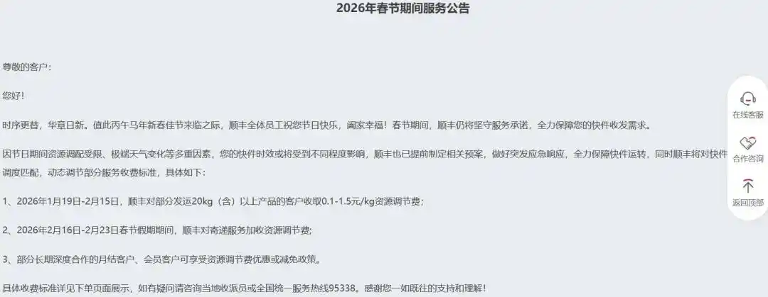 顺丰公告称,因节日期间资源调配受限、极端天气变化等多重因素,快件时效或将受到不同程度影响,将对快件和资源灵活调度匹配,动态调节部分服务收费标准。其中:2026年1月19日—2月15日,顺丰对部分发运20kg(含)以上产品的客户收取0.1—1.5元/kg资源调节费;2026年2月16日—23日春节假期期间,顺丰对寄递服务加收资源调节费。部分长期深度合作的月结客户、会员客户可享受资源调节费优惠或减免政策。