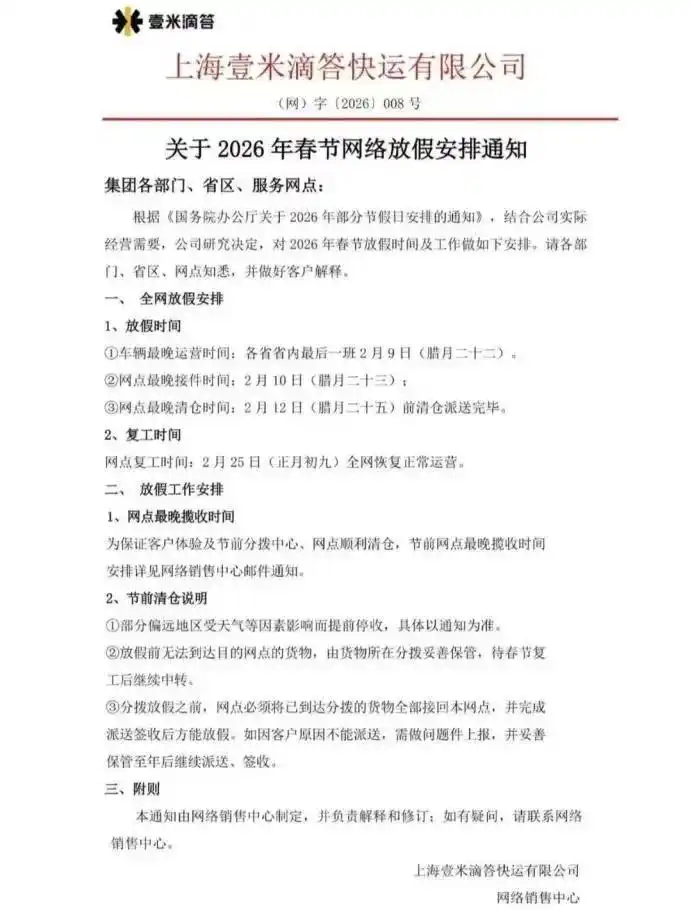 壹米滴答、顺心快运假期停运