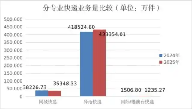 从业务类型来看,异地快递占主导,传统业务持续转型。2025年异地快递业务量累计完成43.34亿件,同比增长3.54%,占全部快递业务量的92.22%。同城快递、国际/港澳台快递业务量则延续下滑趋势,分别同比下降7.53%和18.02%。