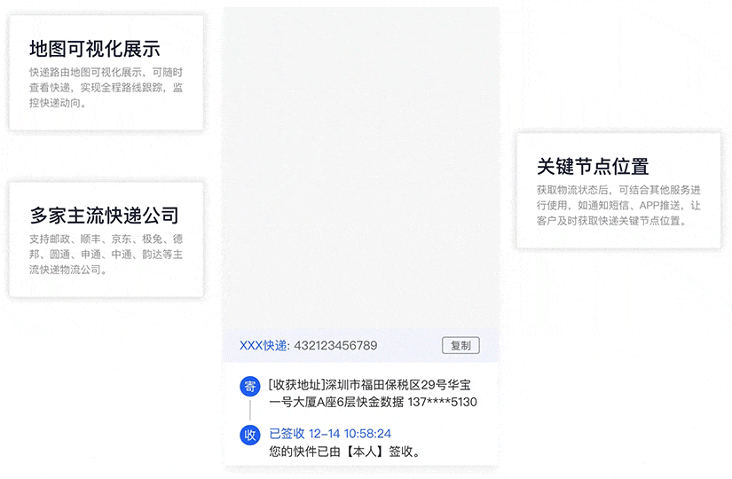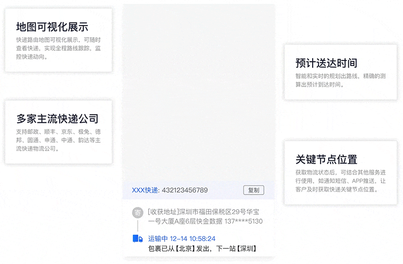 用于企业邮寄合同、文件等场景,实现地图可视化,同时方便客户查询预计到达时间。